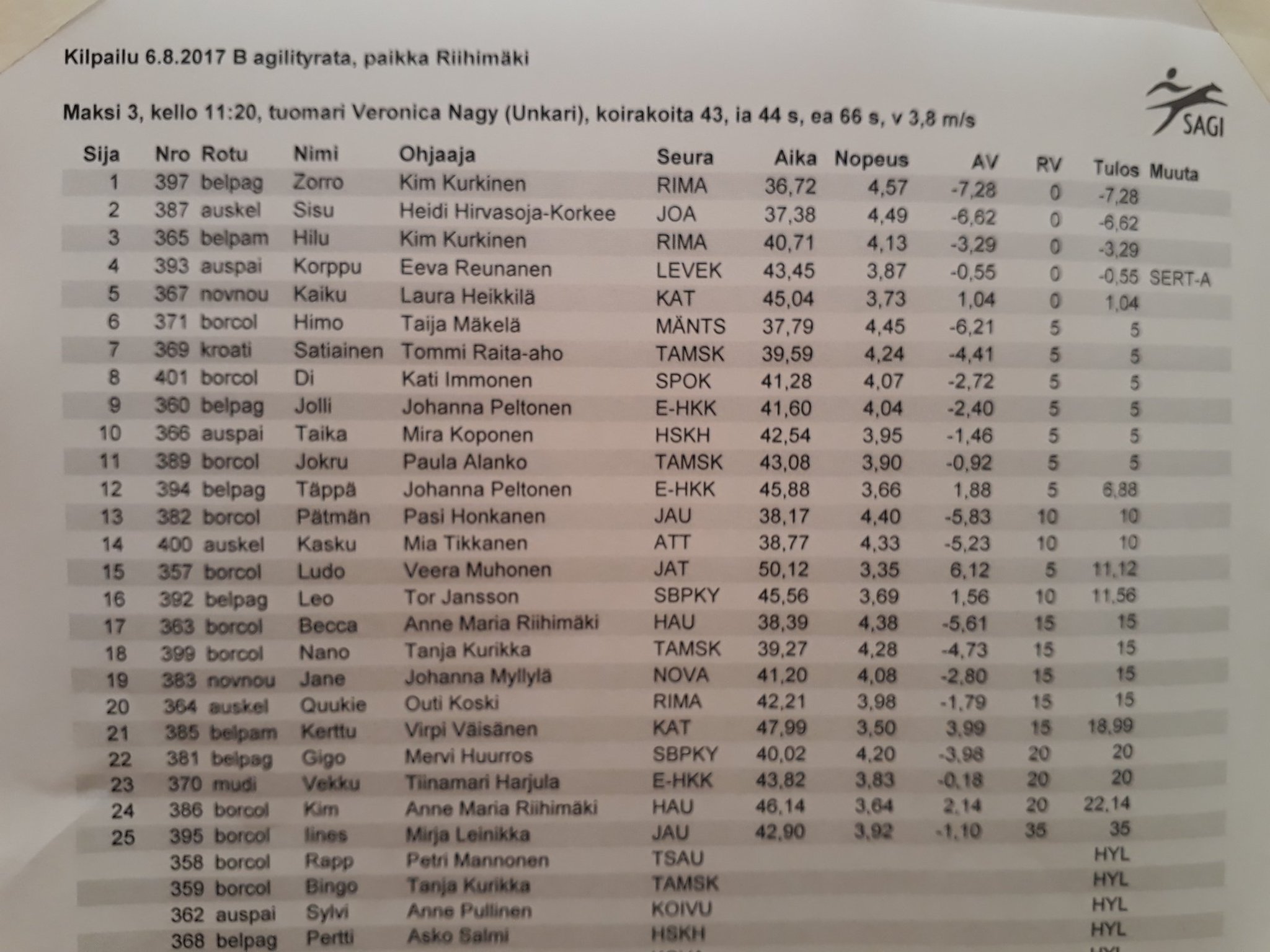 No, Hilu oli ilmottu kahteen agistarttiin ja yhdelle hyppärille oikean ohjaajansa eli Kimin kanssa. Eka rata meni Hilulta ihan ”perseilyksi”…Ei ollut Kimin kanssa yhtään yhdessä tekemässä vaan etsi minua ja tuomarikin oli häiriöksi. Tulos kymmenen virhettä, rima ja keinun ylösmeno. Sijoitus kuitenkin 10 / 40.