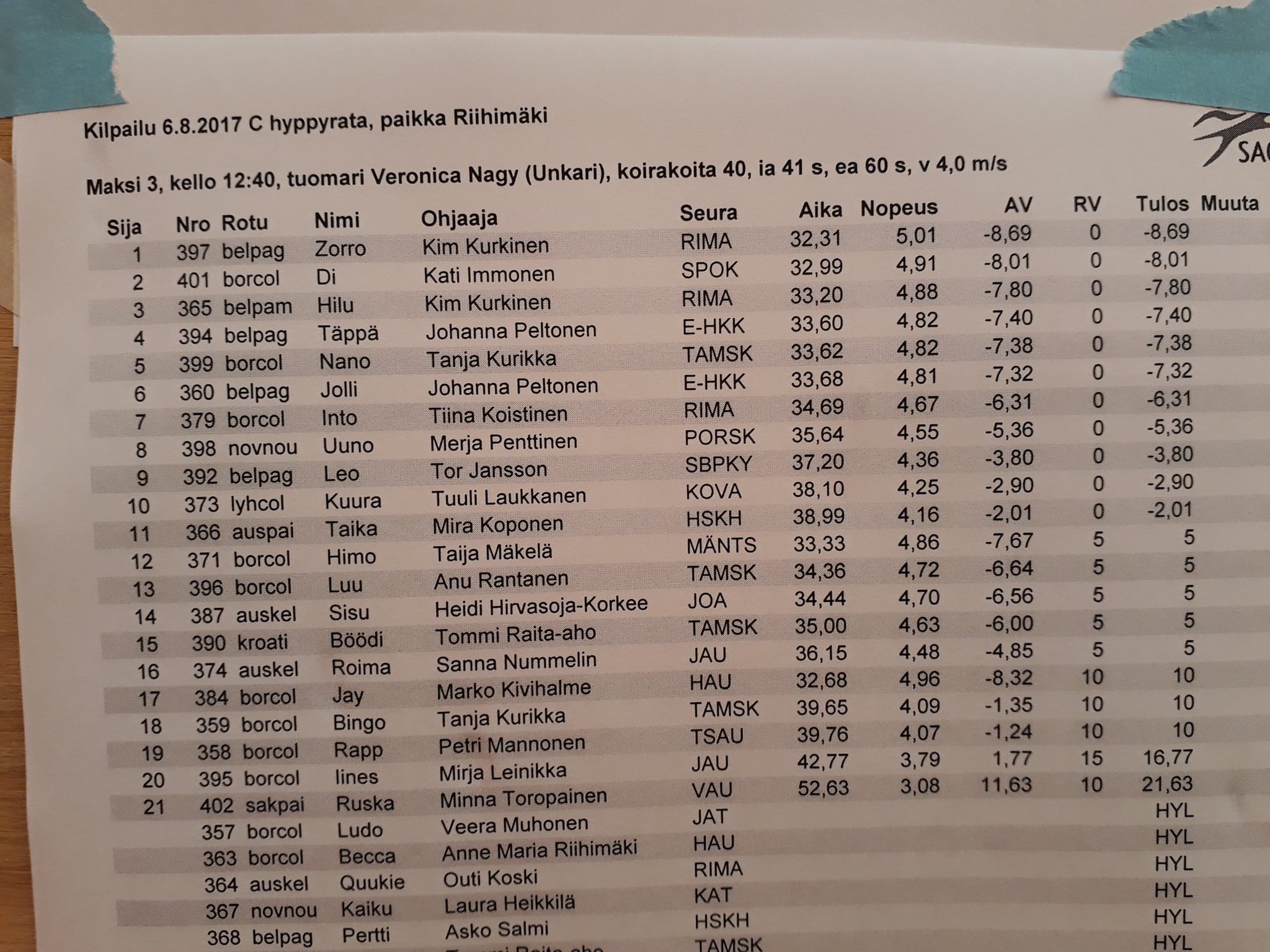 No, Hilu oli ilmottu kahteen agistarttiin ja yhdelle hyppärille oikean ohjaajansa eli Kimin kanssa. Eka rata meni Hilulta ihan ”perseilyksi”…Ei ollut Kimin kanssa yhtään yhdessä tekemässä vaan etsi minua ja tuomarikin oli häiriöksi.  Tulos kymmenen virhettä, rima ja keinun ylösmeno. Sijoitus kuitenkin 10 / 40.